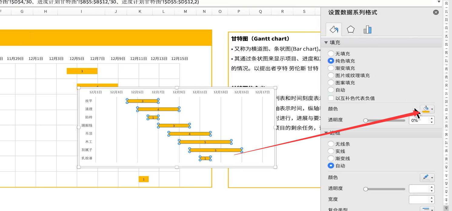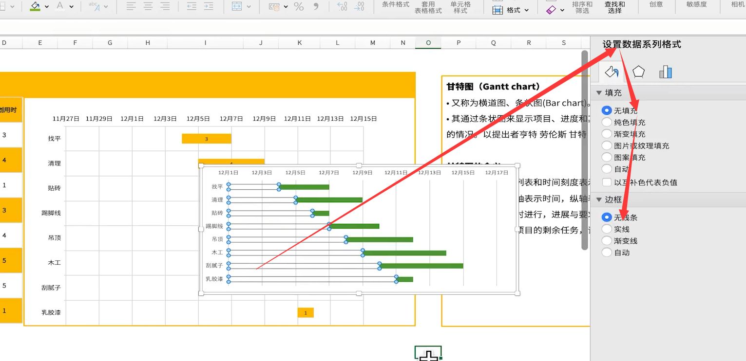 8、设置“开始日期”数据条形图格式。在图标上选中条形图中计划开始日期部分→设置数据系列格式→填充→无填充,边框→无线条