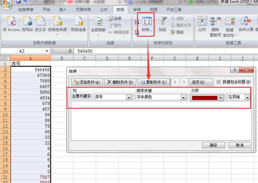 第三步:对A列数据进行排序,排序依据选择“字体颜色”,次序选择颜色。如图设置: