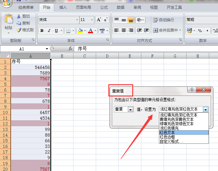 第二步:将重复值设置为某种颜色,小编选择的是红色文本(即字体为红色)。如图: