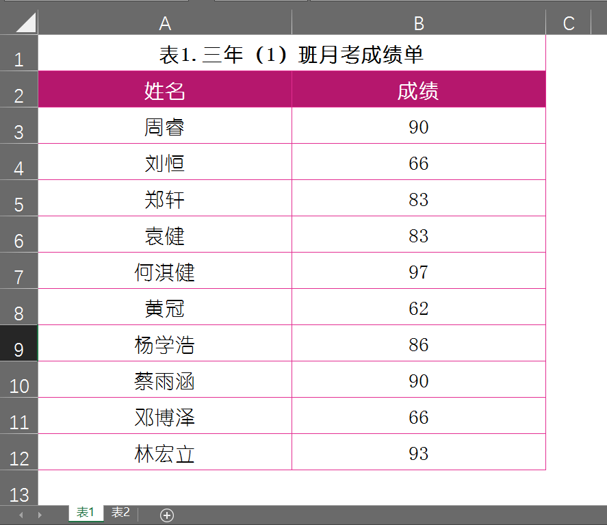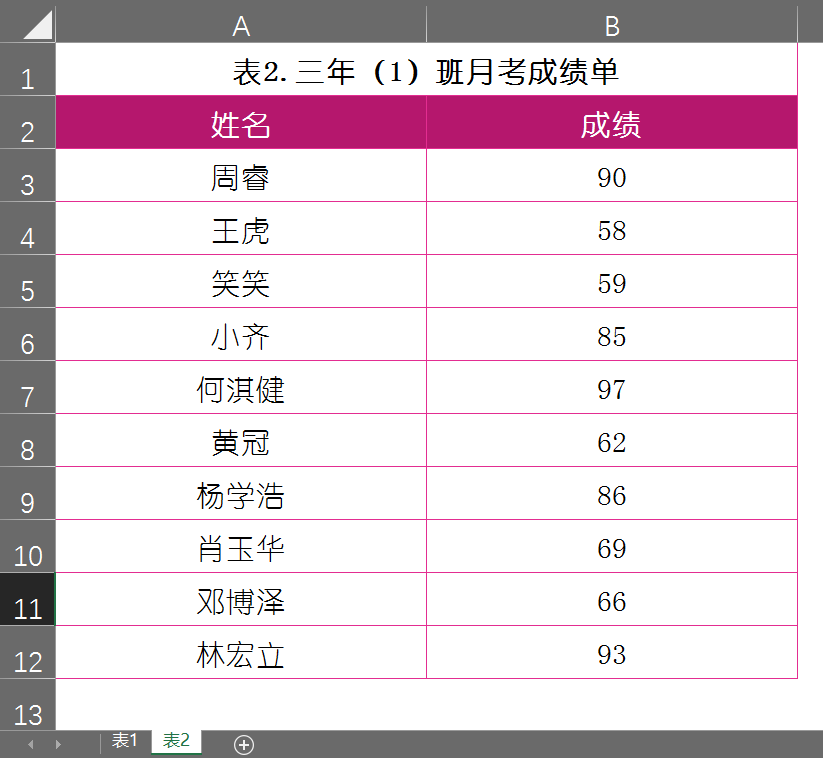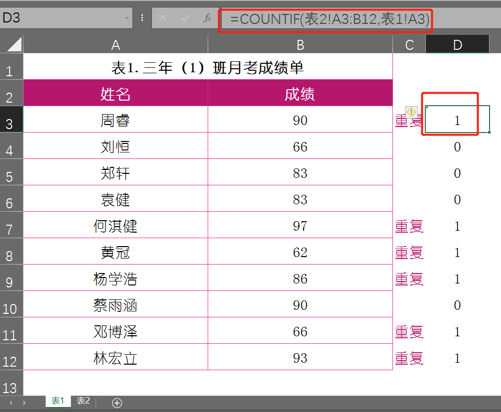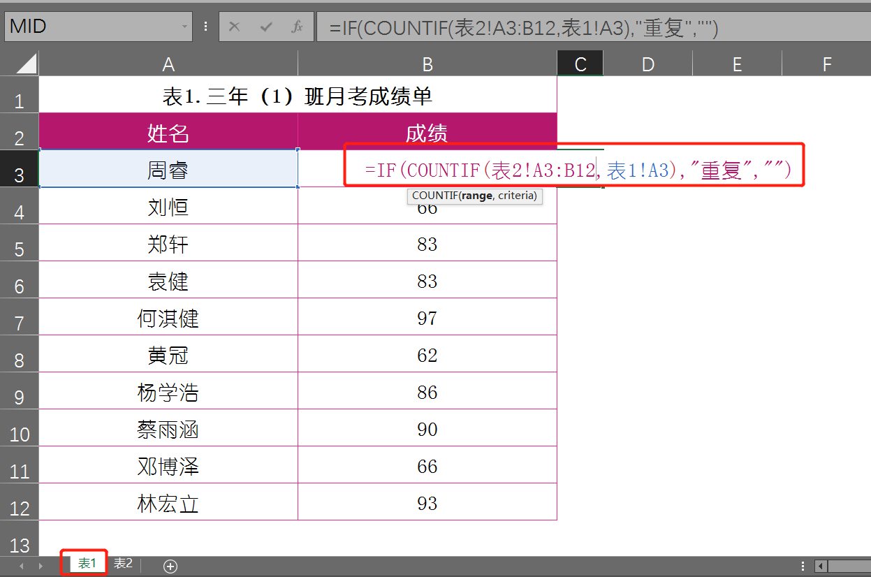 这里需要使用到【IF函数】和【COUNTIF函数】,如下图所示的表1和表2都是关于三年(1)班的月考成绩单,现在需要查找出两份成绩单中重复出现的人员数据。