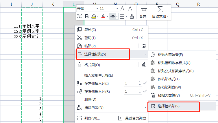 第2步:在需要复制到位置,点击顶部的字母选中整列,单击鼠标右键,出现菜单后,点击选择性粘贴-选择性粘贴
