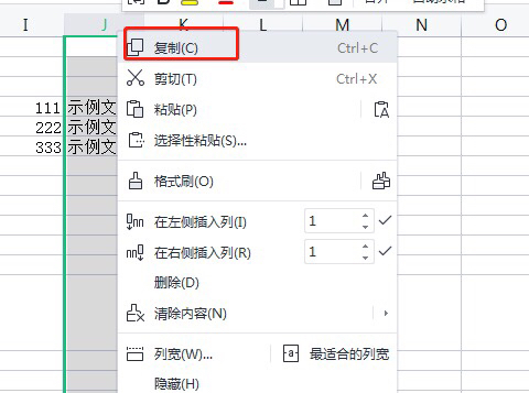 第1步:打开excel,点击需要完全复制的列顶部的字母,选中整列,单击鼠标右键,出现菜单后,点击复制
