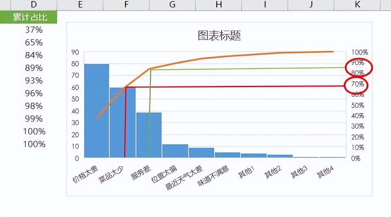 在所有原因中,前两项的累计占比就达70%(看红色线),而前3项累计占比接近85%(看绿色线)。