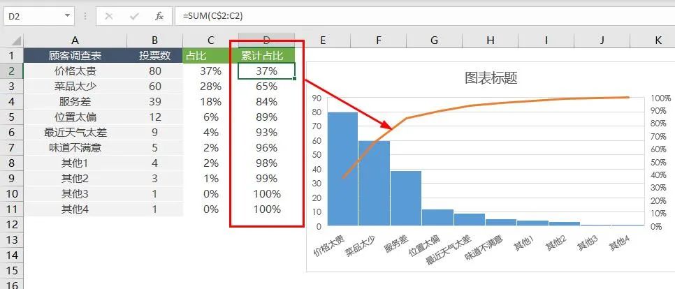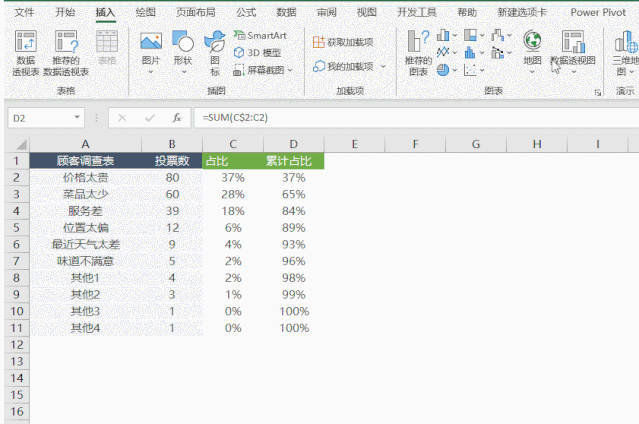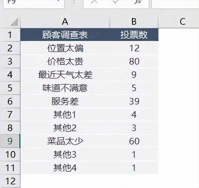 从上面这个表中,从数字大小可以判断出价格、服务、菜品少可能是顾客少的主要原因。但几个主要原因总共占多大比例?要手工算?
