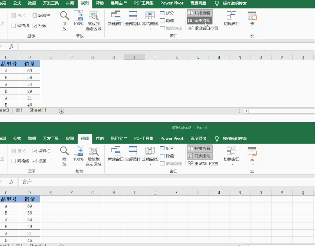 3、单击【视图】——并排查看,随意点击一个excel窗口,滚动鼠标,就能看两表数据。