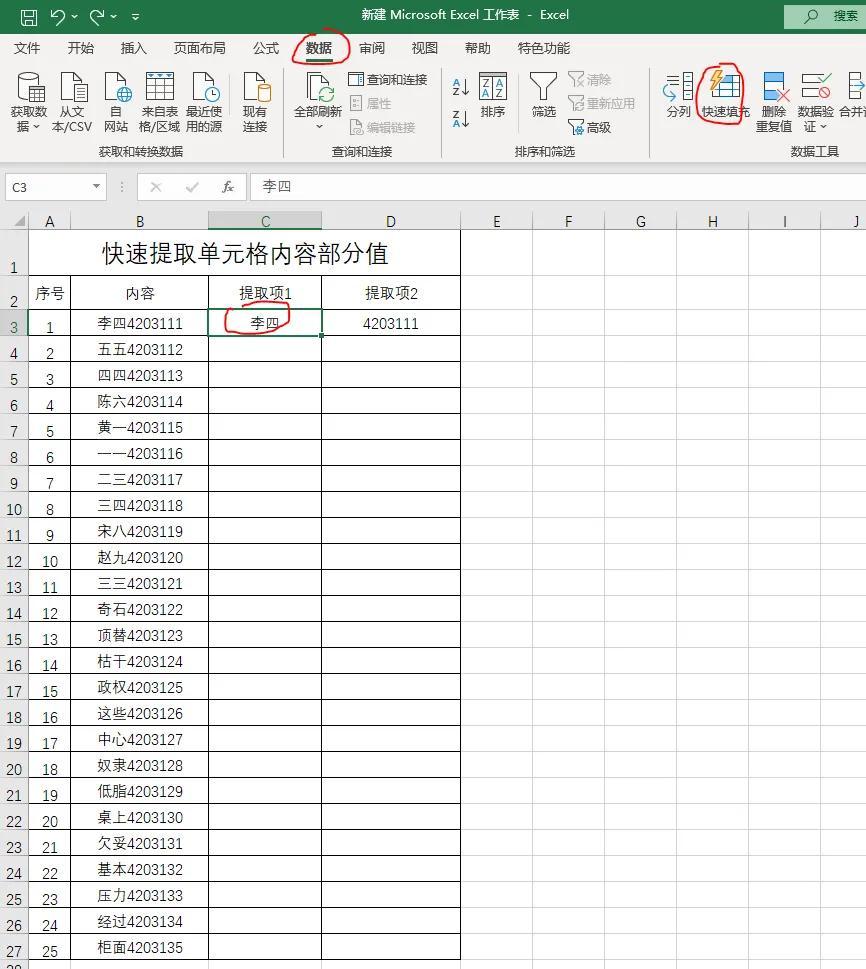 第三步:用鼠标左键选中单元格C3,然后用鼠标点击数据菜单栏,在数据菜单栏下面的工具栏中,点击快速填充图标(或者直接快捷键Ctrl E)。这样就将所有名字提取出来了并填入对应的单元格中了。