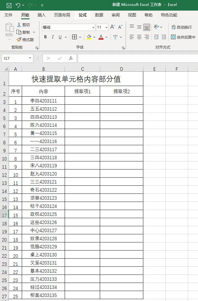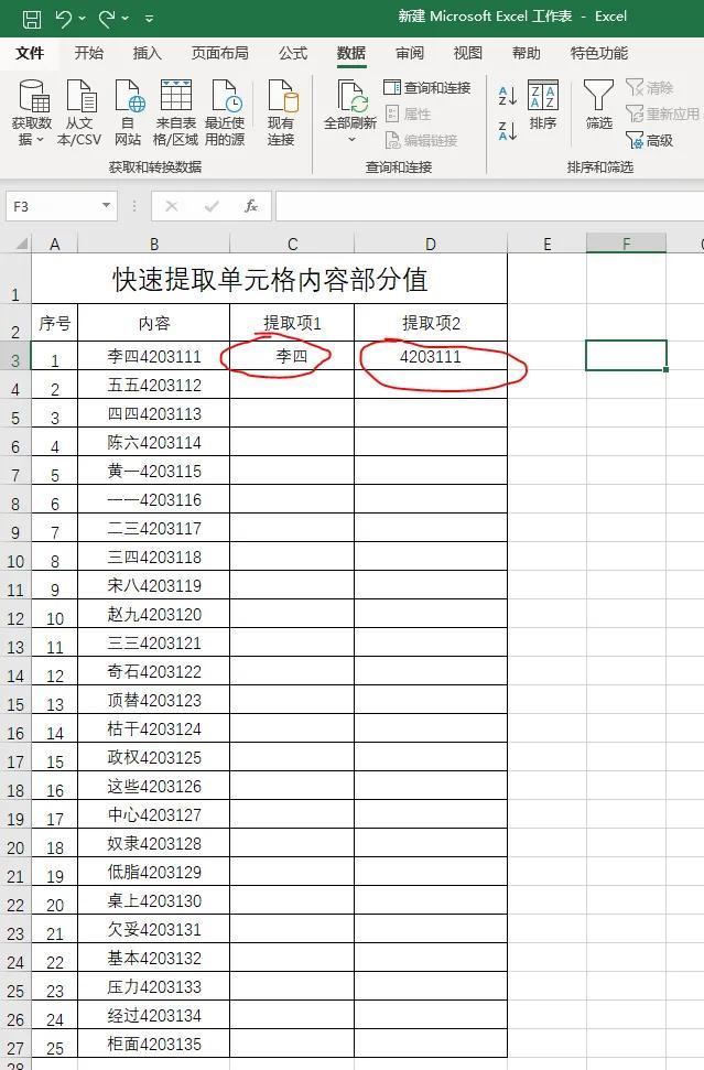 第四步:用鼠标左键选中单元格D3,重复第三步操作,将所有数字提取出来。