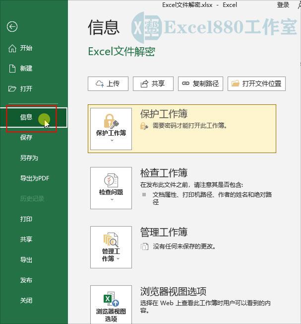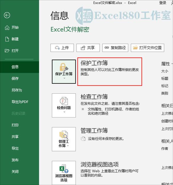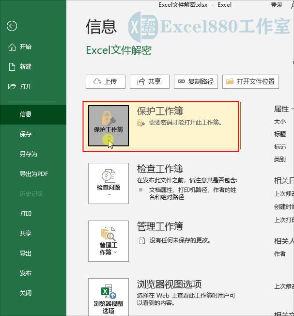 10、返回“信息”界面,此时“保护工作簿”按钮右侧已恢复为白色底纹显示,表示工作表的密码保护已被解除,如下图所示。