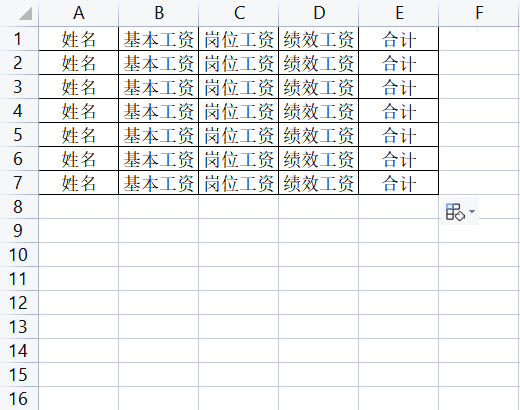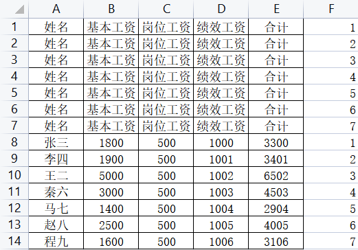 首先看下,我们有7个人的工资哈,新建一个sheet,在单元格中复制粘贴标题,7行,就像下面这样