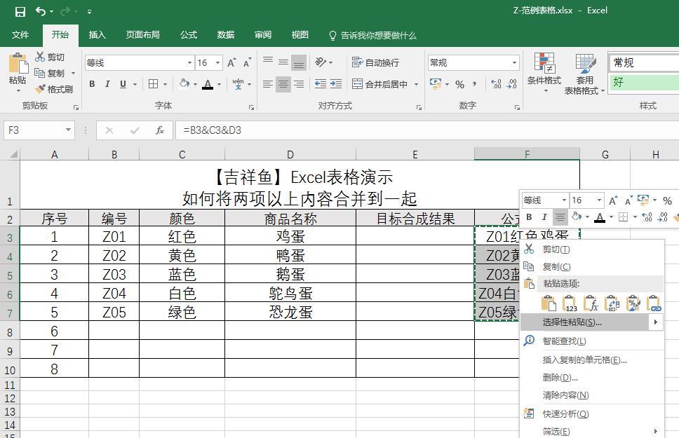 确定目标合成结果,如图例子,表格中需要将“红色”与“鸡蛋”合并到一列中。