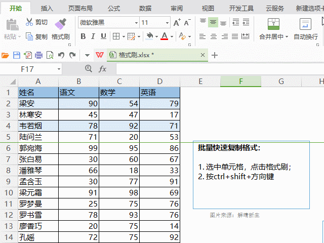 除了快捷键“Ctrl Shift ↓”、“Ctrl F”,格式刷还可以和Shift键等选中单元格的快捷键一起使用。