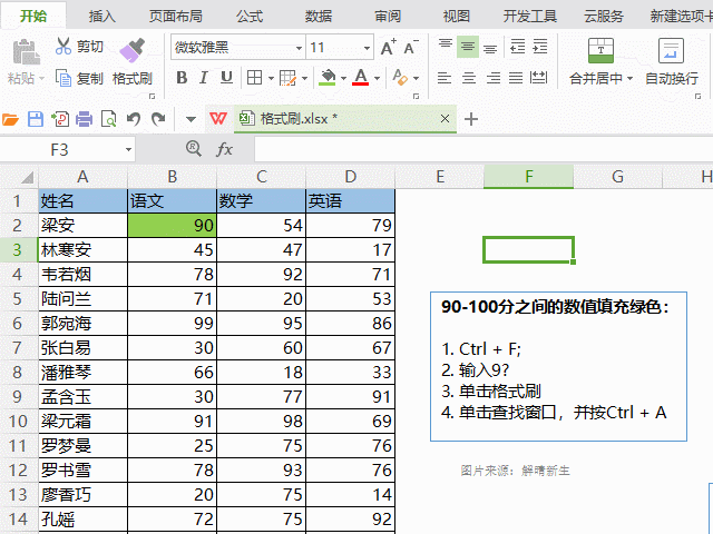 如图,我们先在查找窗口中输入“9?”,查找出所有90-100分之间的分数,接着点击格式刷,然后在查找窗口中按“Ctrl A”,可以快速将90多分的数值填充颜色。相当于使用了条件格式。
