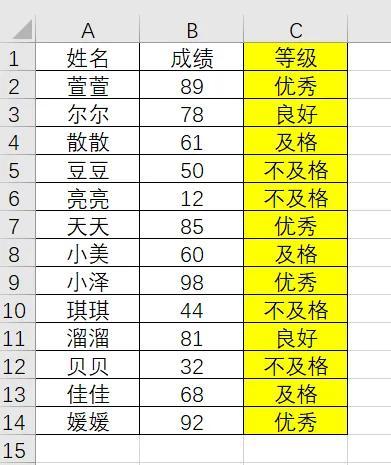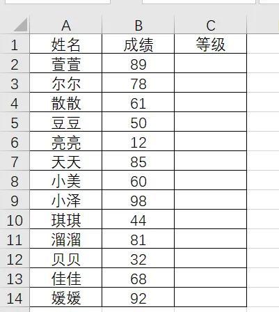假设下面是我们现在拥有原始的数据表格图一,即学生的成绩汇总,可以看到列A是学生姓名,列B是具体的成绩,列C就是我们要填写的成绩类别了。