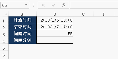 使用公式“=TEXT(B2-B1,”[m]”)”