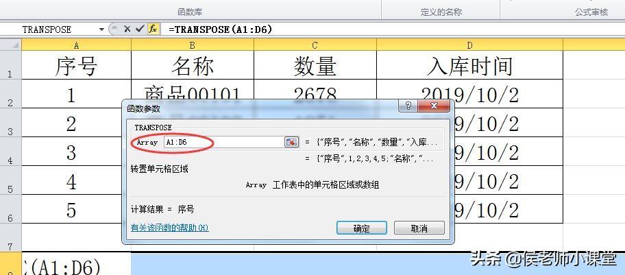 第3步:在弹出的函数参数对话框中,输入需要转置的源表格区域——>单击“确定”;
