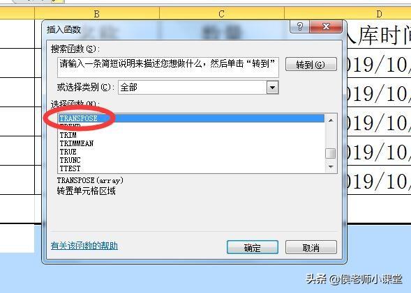 第2步:在弹出的插入函数对话框中,选择“TRANSPOSE”函数——>单击“确定”;