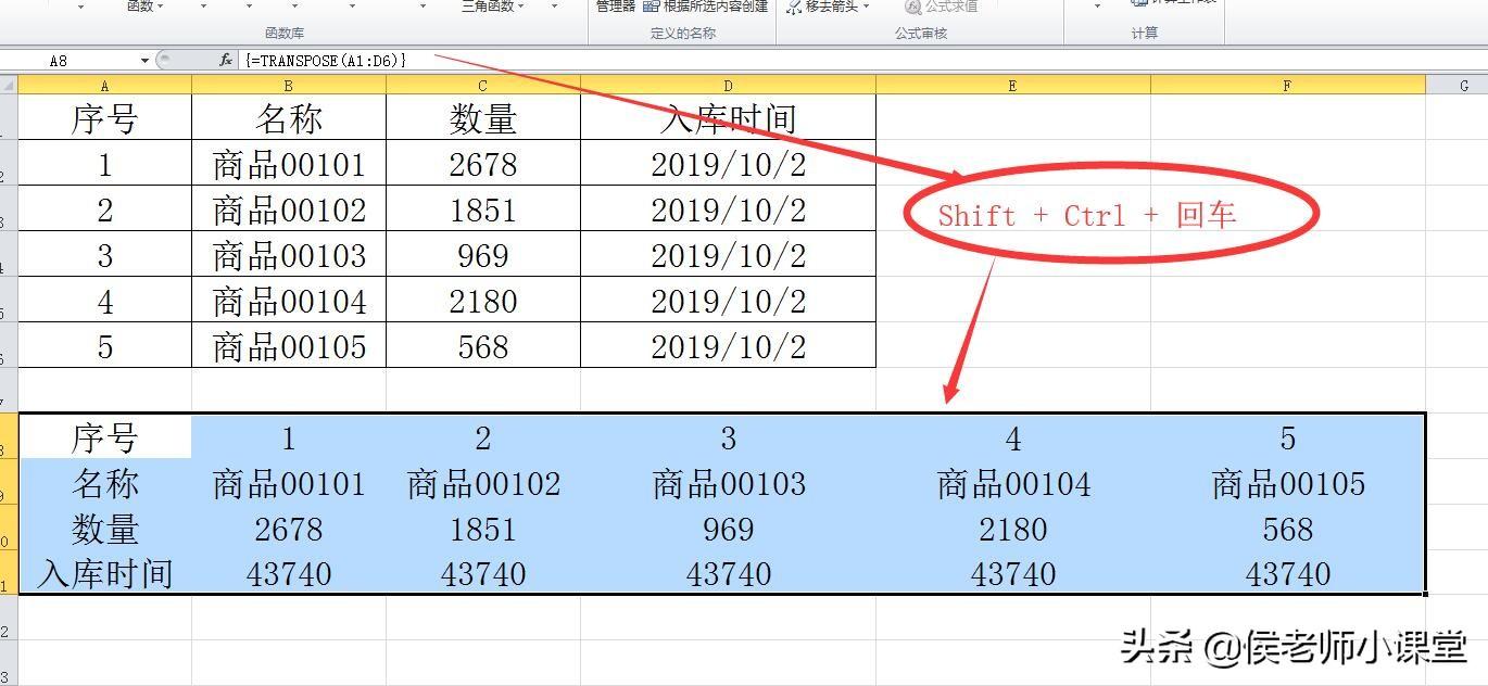 第4步:单击公式输入栏——>然后按下组合键“shift ctrl 回车”,就可以看到转置结果了。