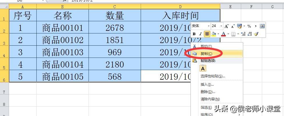 第1步:选中表格数据——>单击鼠标右键——>在弹出的快捷菜单中选择“复制”;