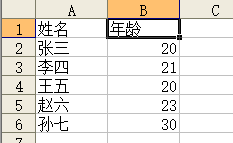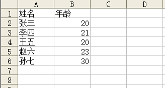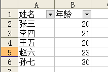 1、以下为了演示和讲解方便,做了一个简单的包括姓名、年龄字段的表格。我们的目的:利用Excel自动筛选功能快速找到年龄大于20的人员。