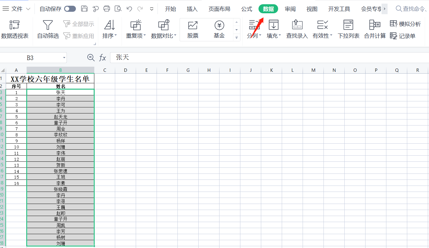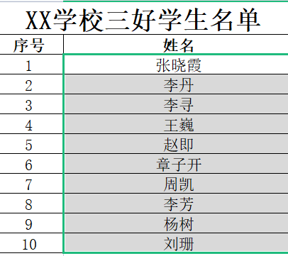 2.选中粘贴上三好学生名单的姓名列所有学生姓名(不含标题)