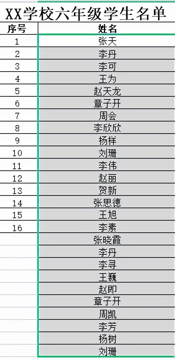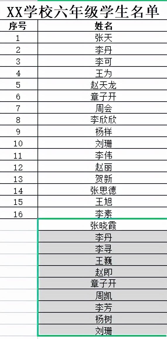 1. 个人习惯原因,建议将数据粘贴到原数据下方,因为往往现实中姓名列后面还有性别、成绩等很多信息,粘贴在下方不影响表格原有信息,实现操作目的后将粘贴部分数据删除即可;