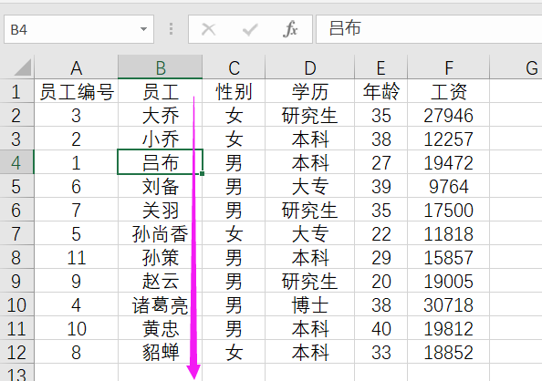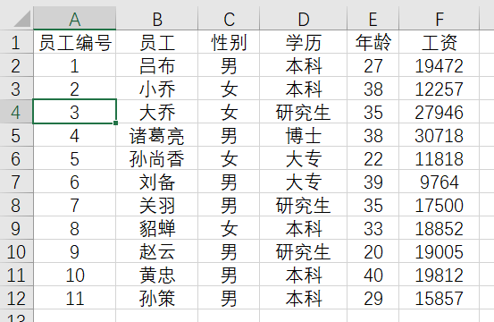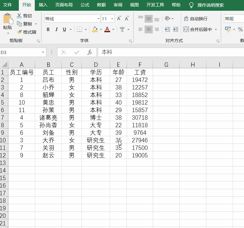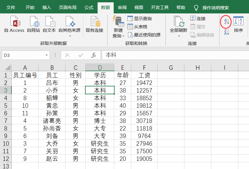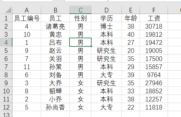 如果我们希望对学历进行自定义的排序,排序的顺序是大专→本科→研究生→博士