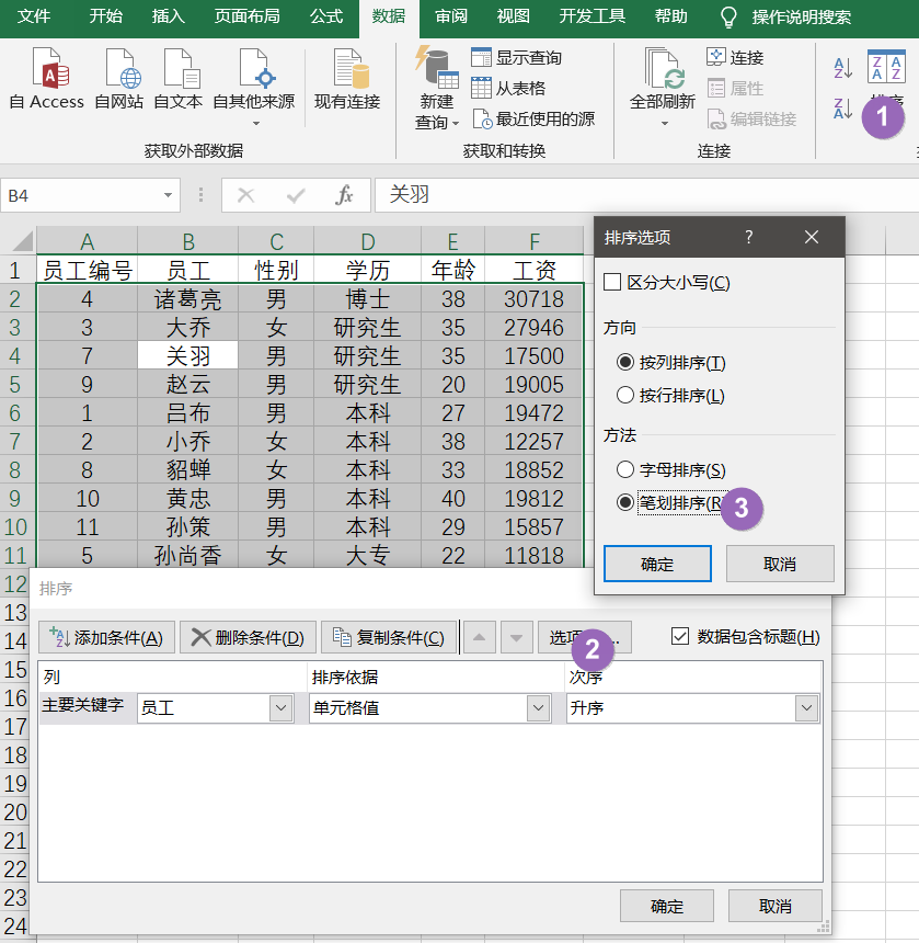 对于员工的姓名,我们需要按笔画进行排序,则可以,在排序的时候,在选项里面进行设置,里面有按笔画进行排序