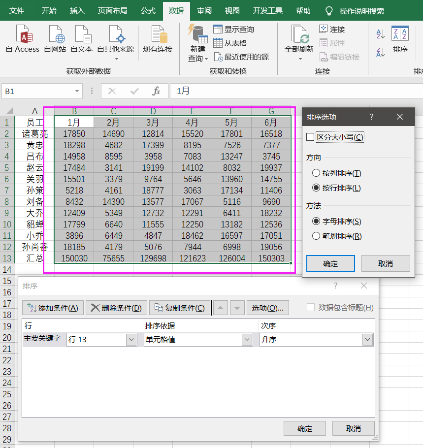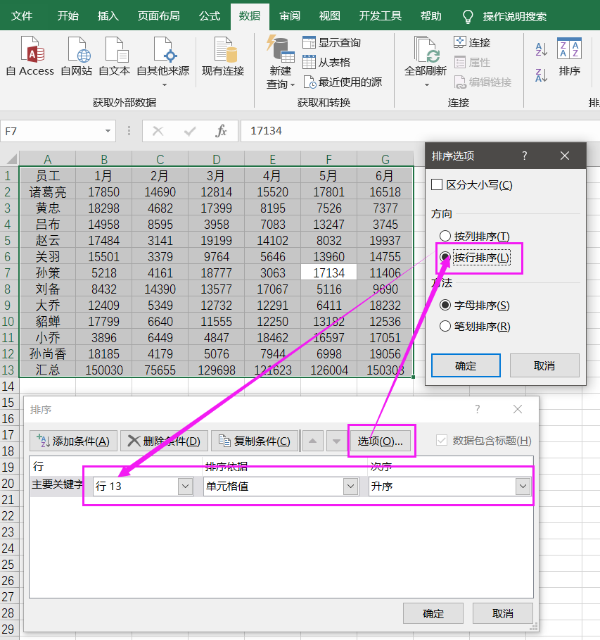 例如有一份员工的工资数据,我们选择数据,点击排序,选择按行排序,将排序的条件改成了第13行数据,