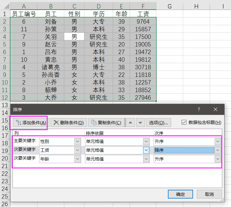 第2条件是按工资进行降序(当性别相同的时候,工资高的排在前面)