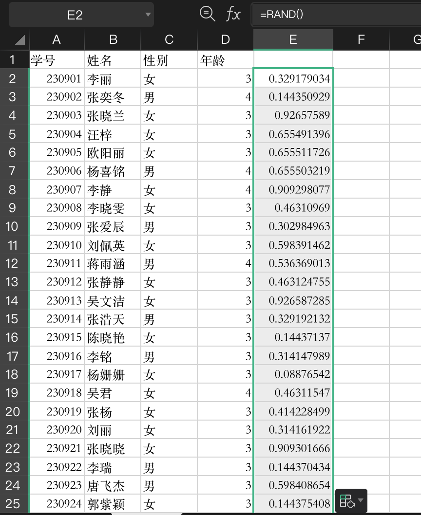 然后选中刚刚生成了随机数的单元格,鼠标光标移动到这个单元格的右下角有个正方形的块,双击鼠标,这时候剩余行也全部填充了一个随机数。