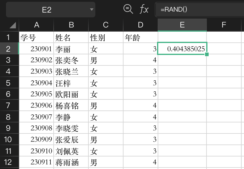 execl中有一个rand()函数,它可以随机产生一个大于等于0小于1的小数,只要在表格中最后一列数据之后的空白列的第一个单元格中输入“=rand()”,回车后会看到单元格中显示了一个随机小数。