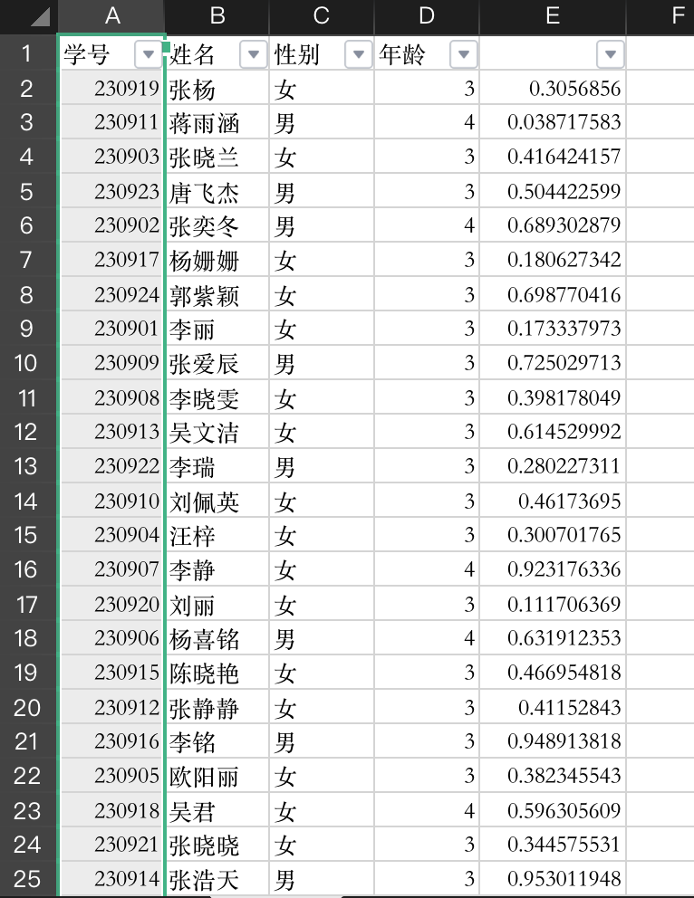 再选中第一行,任意一个单元格,按下自动筛选快捷键 ctrl shift L ,然后选择随机数那一列的第一行的单元格,选择升序或者降序,可以看到原有的已经被打乱了。