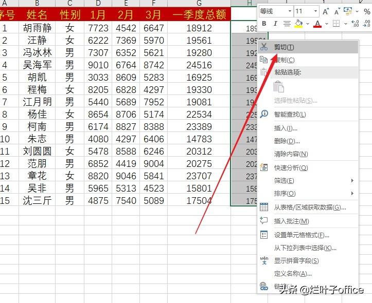 (4)如下图所示,选择复制的数据区域,在其上右击,在弹出的快捷菜单选择“剪切”;