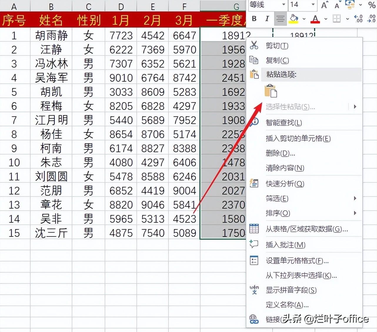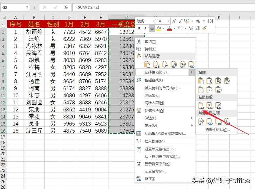 例如:将如下图示的“一季度总额”列用公式计算的数据转换为数值。