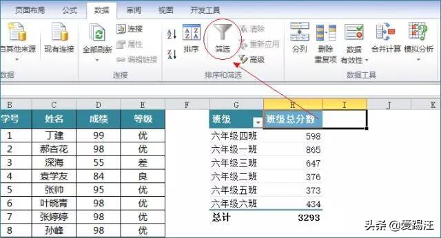于是,本汪接到非常多的Excel群友们问:为何我做的透视表在选择“数据筛选”的时候是灰色的啊,麻烦问问是我哪里弄错了吗?你没有错,童鞋!我们操作也是一样的。那要怎么才能筛选总分数在500分以上的班级啊。在回答之前,我们先来普及一个Excel小知识:在数据透视表中设置自动筛选,最基本的原则:一定要引用一个数据透视表之外的单元格区域,一个单元格即可,直接选择透视表内部的数据是不能筛选的。哦,原来是这样。那好,我们接着操作一回试试。