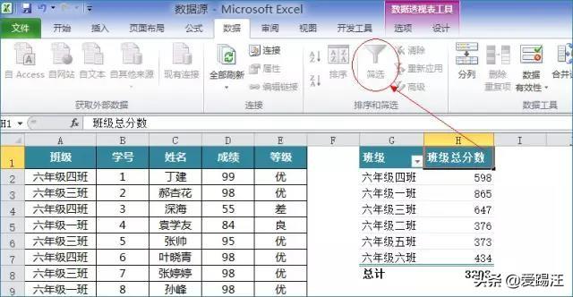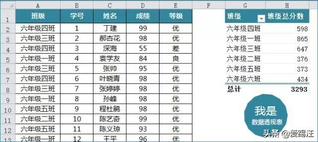 嗨,我是爱踢汪。本汪今天要为大家分享一招干货,怎样突破Excel数据透视表的数据筛选问题。这也是曾经困扰了很多Excel用户。下面截图,右边是以左边A:E的数据源制作出来的数据透视表。现在的问题:我们如何对H列的班级总分数进行筛选,将班级总分为500以上的筛选出来?