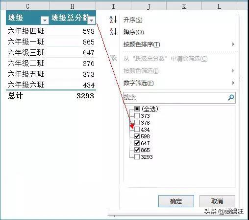 使用excel2016版本的小可爱可以直接选中I1单元格,再点击筛选。这样在“班级总分数”上同样会出现筛选的下拉箭头。到这一步就好办啦!点击“班级总分数”的三角形展开就可以筛选数字了。