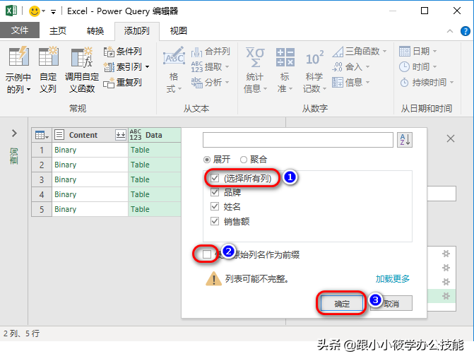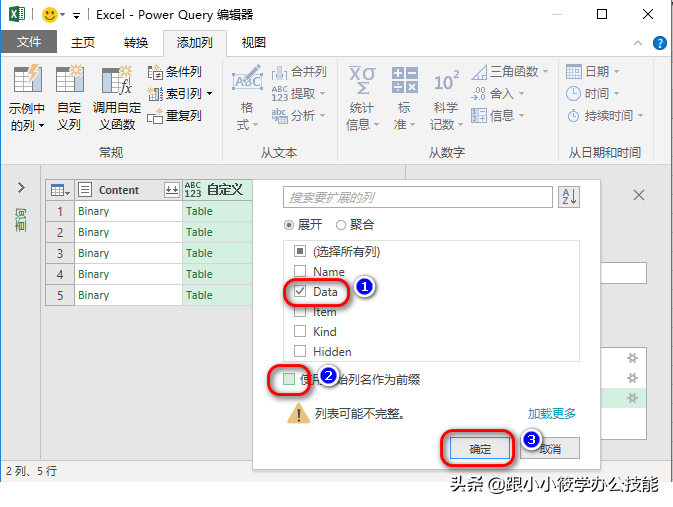 10、可以看到这一列的列名就变成“Data”了,而不是“自定义”– 再次点击“Data”右边的“扩展”按钮 — 在“选择所有列”前面的复选框打钩,不勾选“使用原始列名作为前缀”前面的复选框 — 点击“确定”按钮。