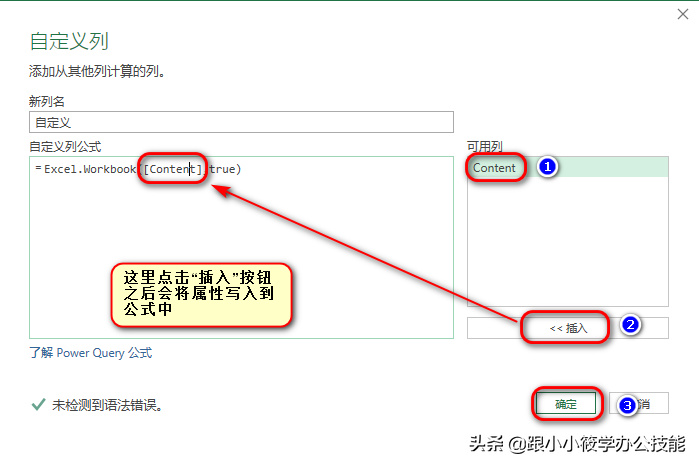 8、弹出“自定义列”对话框 — 在“自定义列公式”中输入公式“=Excel.Workbook([Content],true)”– 其中Content值为“可用列”点击插入的 — 点击“确定”按钮。