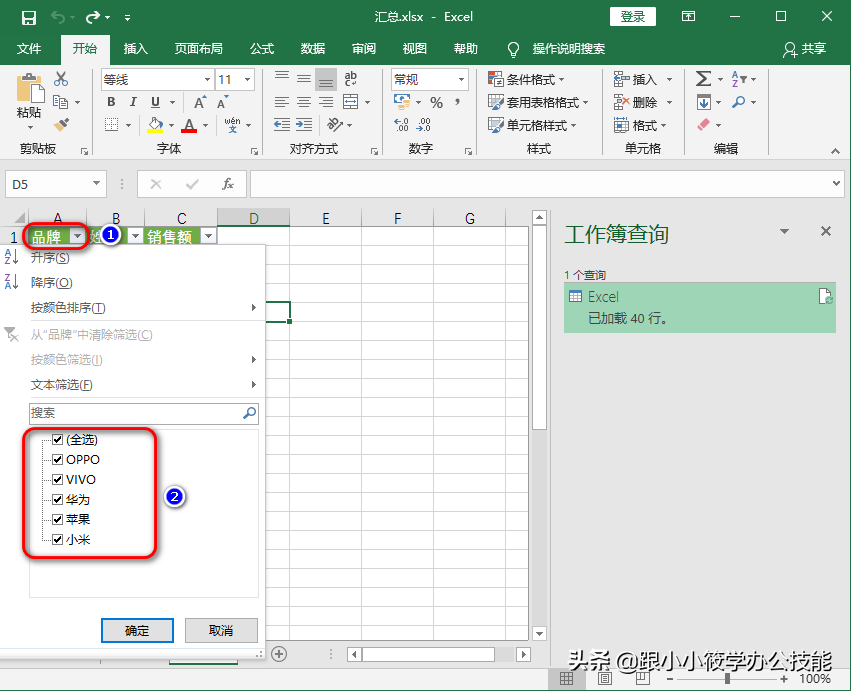 13、以上步骤操作完成之后,可以看到5个工作簿的数据都汇总到一个工作表中了。点击“品牌”右边的筛选按钮 — 里面就可以看到这5个表的数据。