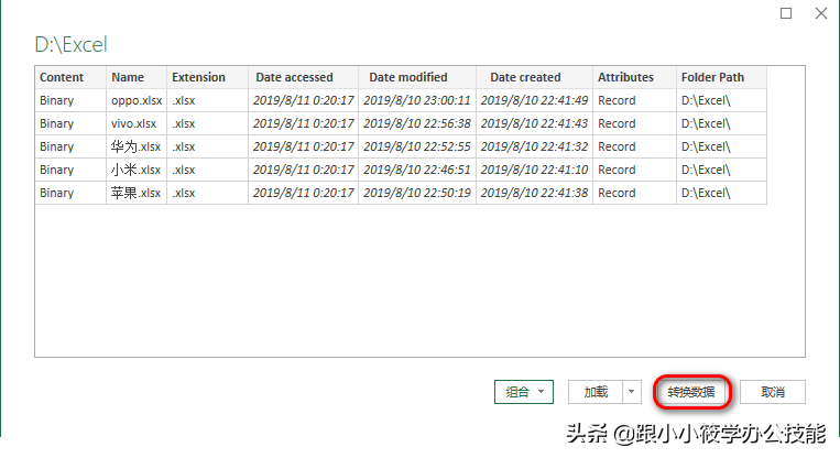 5、点击“确定”按钮之后 — 可以看到文件夹下的所有工作簿都显示在下面这个界面上 — 点击“转换数据”按钮。