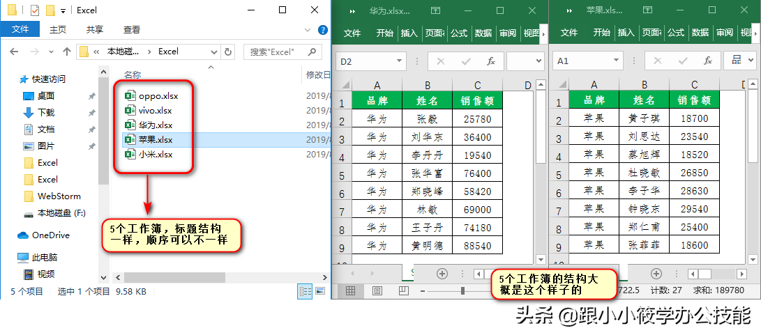 下图的Excel文件夹里面,放置了5个工作簿,每个工作簿里面的数据结构一样,但标题的顺序可以不一样。