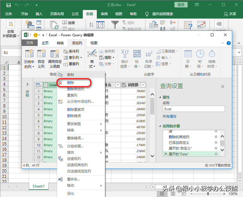 11、现在我们可以看到我们工作簿的所有数据都显示出来了,但多了一个Content列,所以需要删除。选中Content列 — 点击“鼠标右键”– 在右键菜单中选择“删除”。