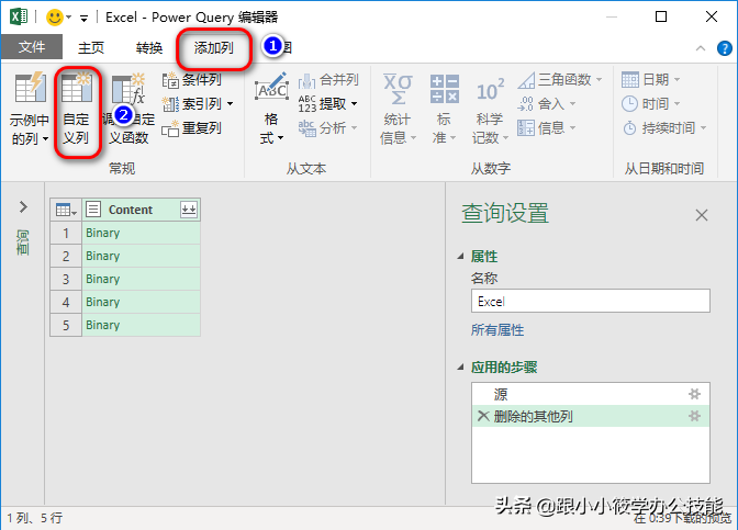 7、删除其他列之后欧只剩下Content这一列 — 点击“添加列”选项卡 — 在“常规”工具组中点击“自定义列”。