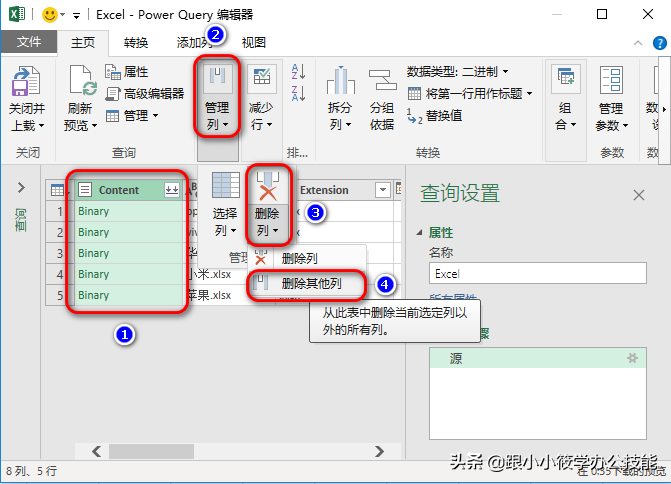 6、弹出“Power Query 编辑器”对话框 — 选中“Content”列 — 点击“管理列”– 点击“删除列”–“删除其他列”。