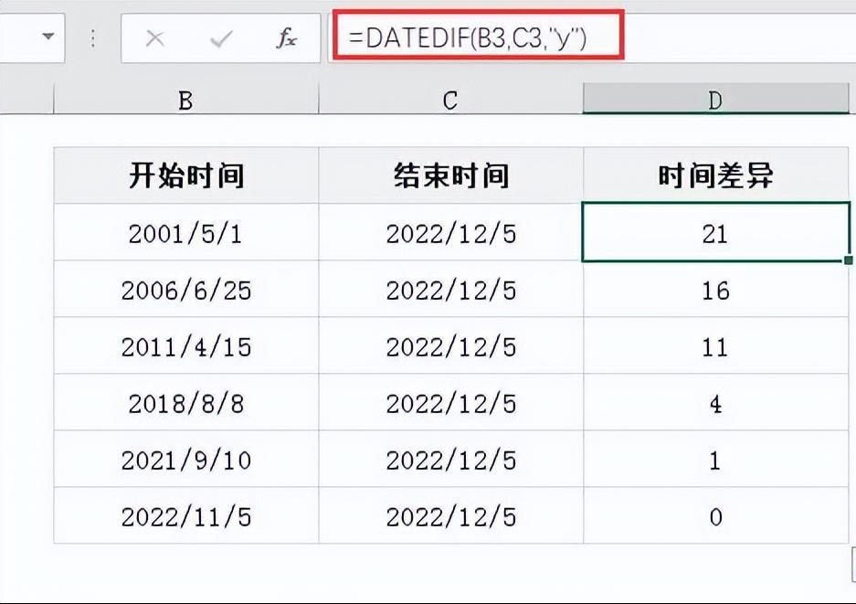 如下图所示,根据开始时间和结束时间,通过=DATEDIF(B3,C3,”Y”)可以结算2个时间点之间的年份差异,结果为整数只是以年份进行计算的。