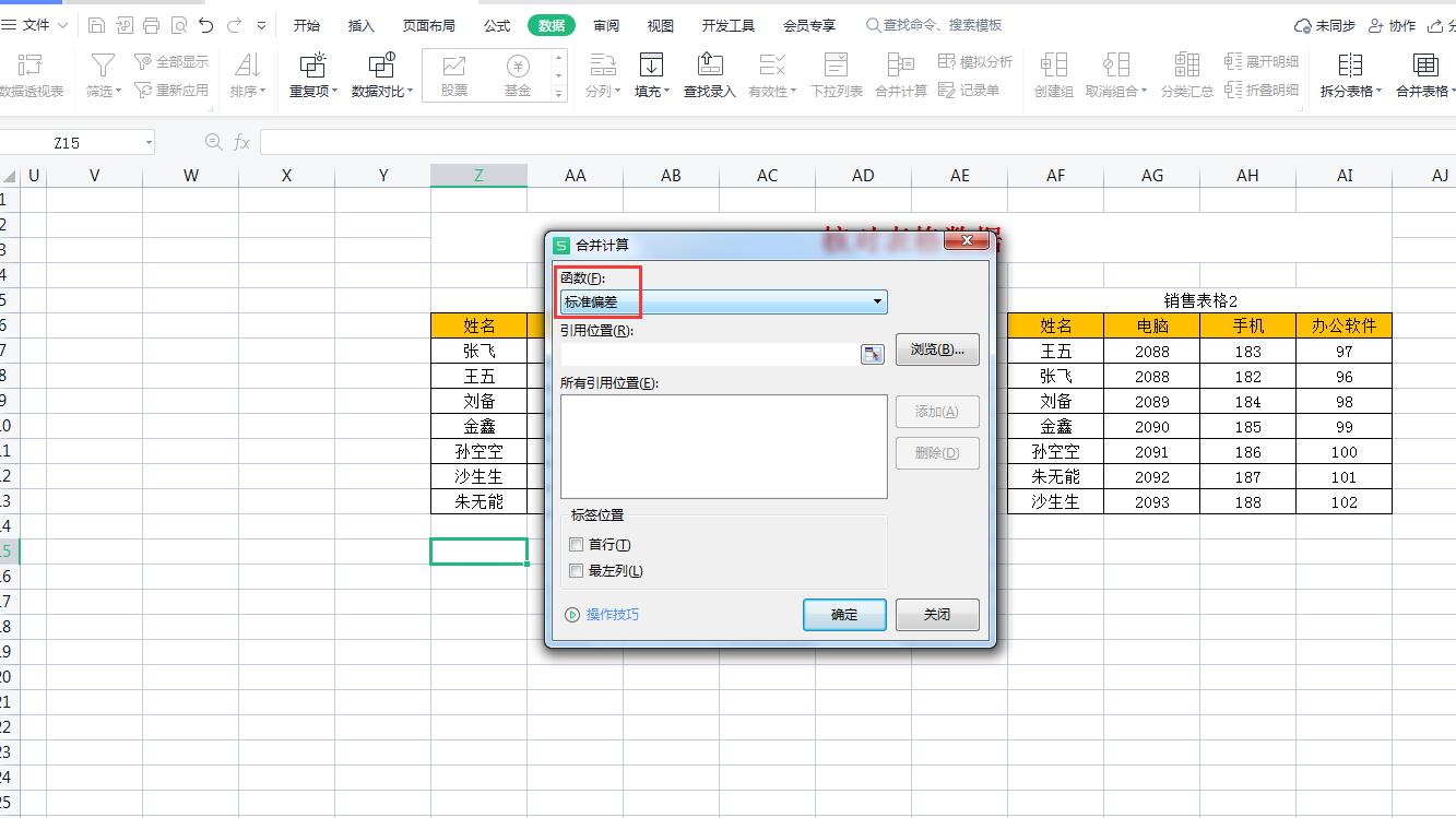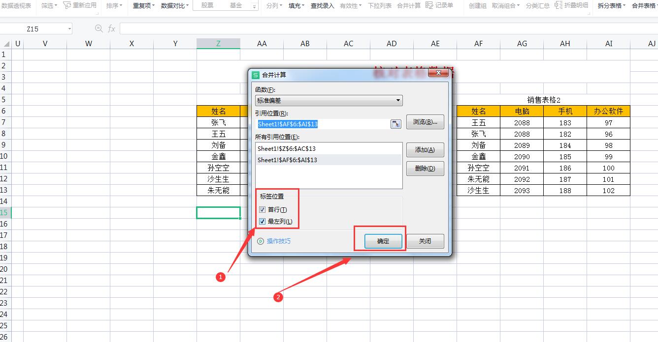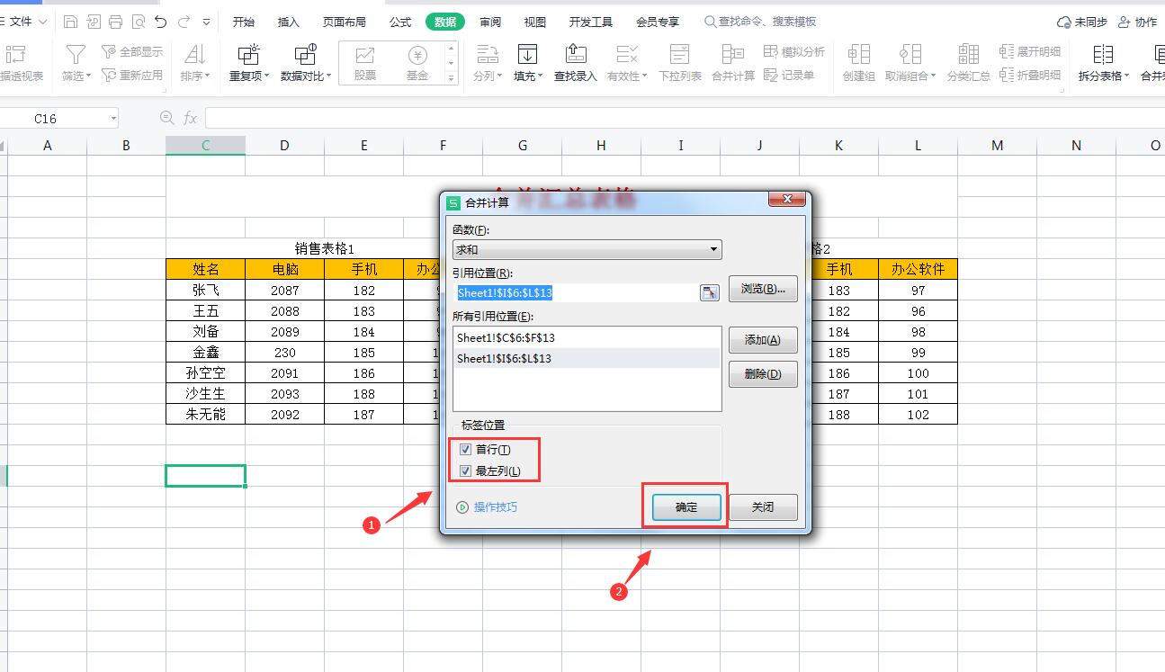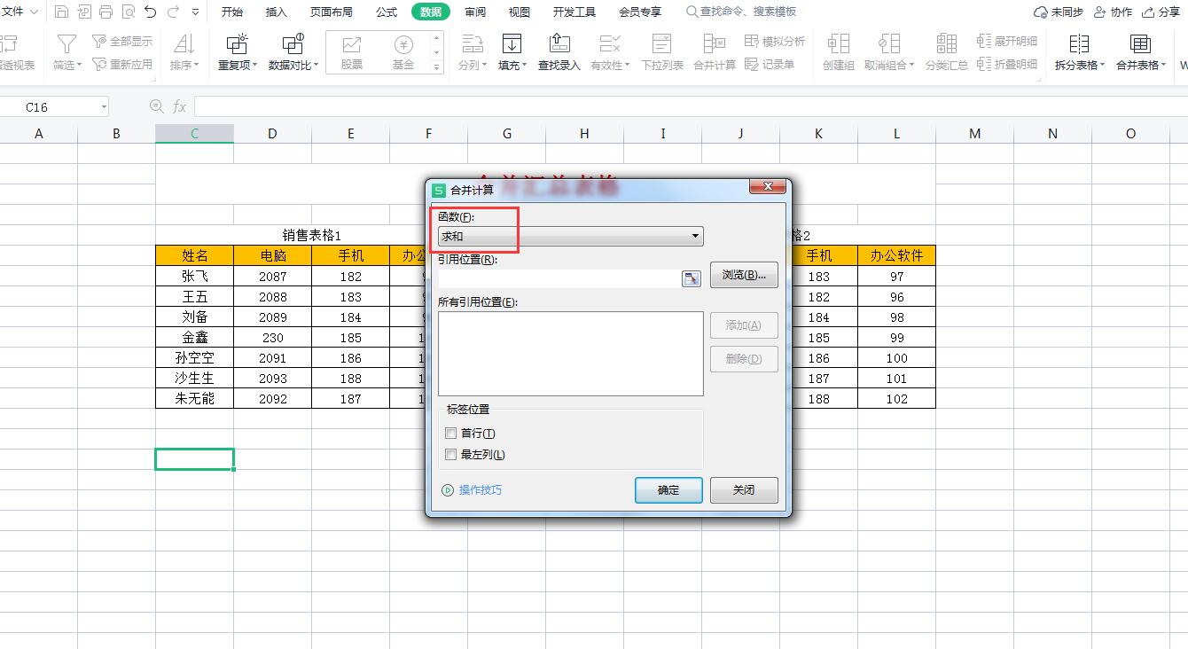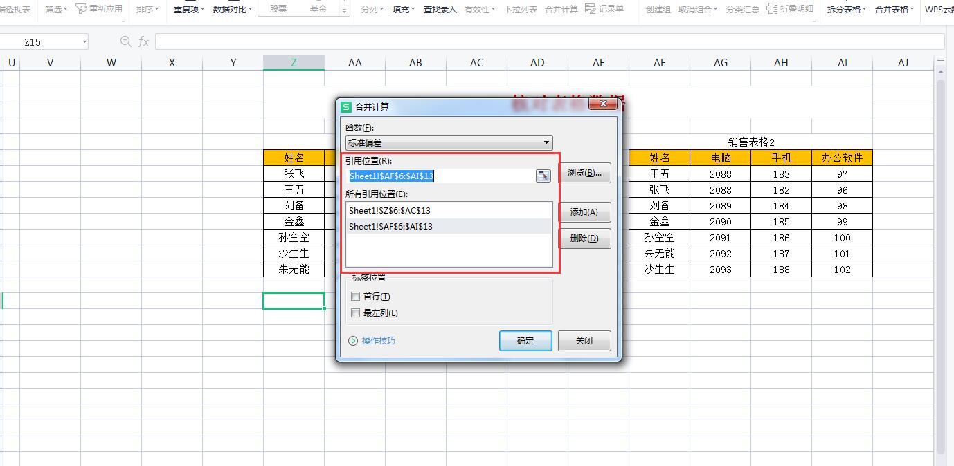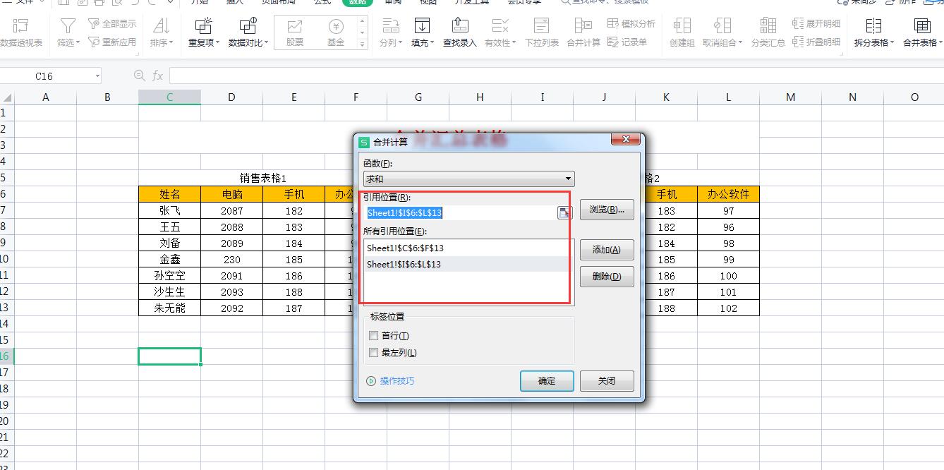 ②“引用位置”分别选择:销售表格1,销售表格2的数据区域,将它们添加到“所有引用位置”中;