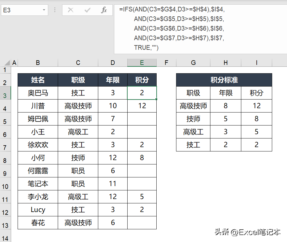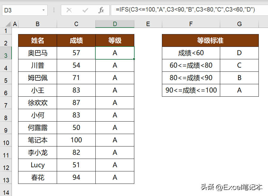 Excel笔记:IFS依次执行条件判断,一旦条件成立,输出对应结果并终止程序,不再往下执行。