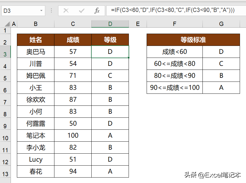 =IF(C3<60,"D",IF(C3<80,"C",IF(C3<90,"B","A")))