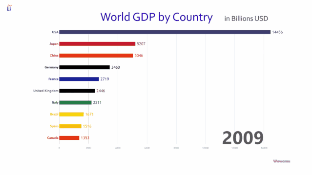 大家之所以喜欢看这个图,在于它切换转场的动画效果,你可以看到条形图浮上来和沉下去,变长和缩短,非常连续、平滑,大家主要是被它的动画效果吸引,觉得很炫啊。但 Excel 里是没有这个动画的,效果就大打折扣了。